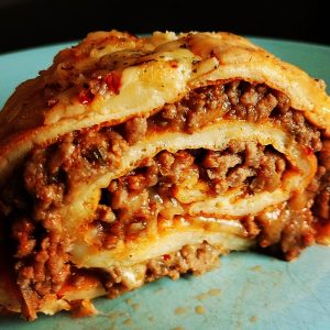 Pilko punainen chili. Lisää tomaattipyree ja chilisilppu sekaan. Sekoita kunnolla sekaisin ja anna hautua hetki. Levitä paistettu ja maustettu jauhelihaseos tasaisesti pohjan päälle. Jätä pohjan toinen pää hieman vajaaksi.